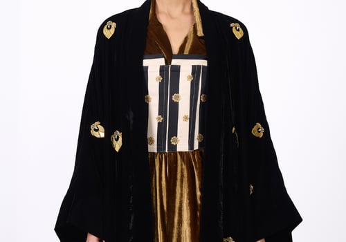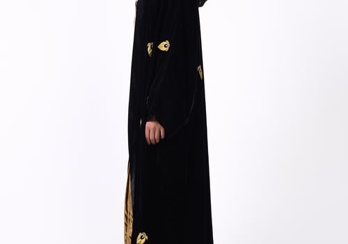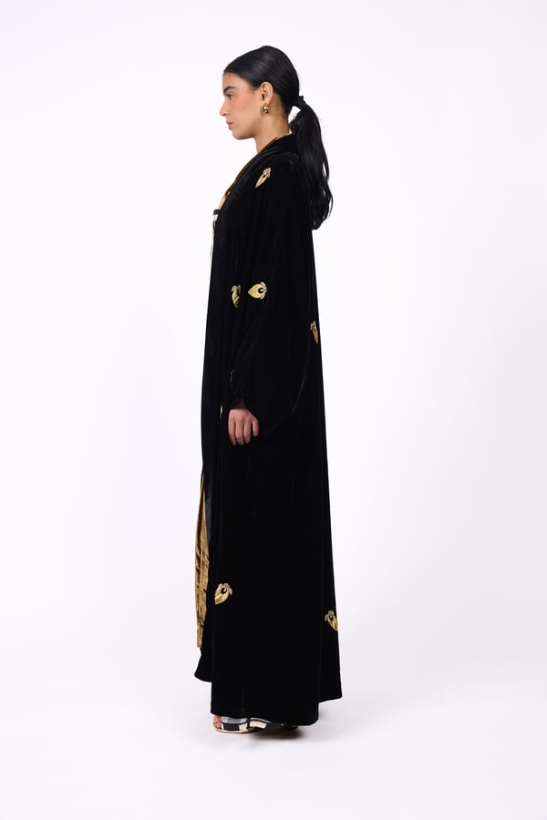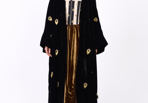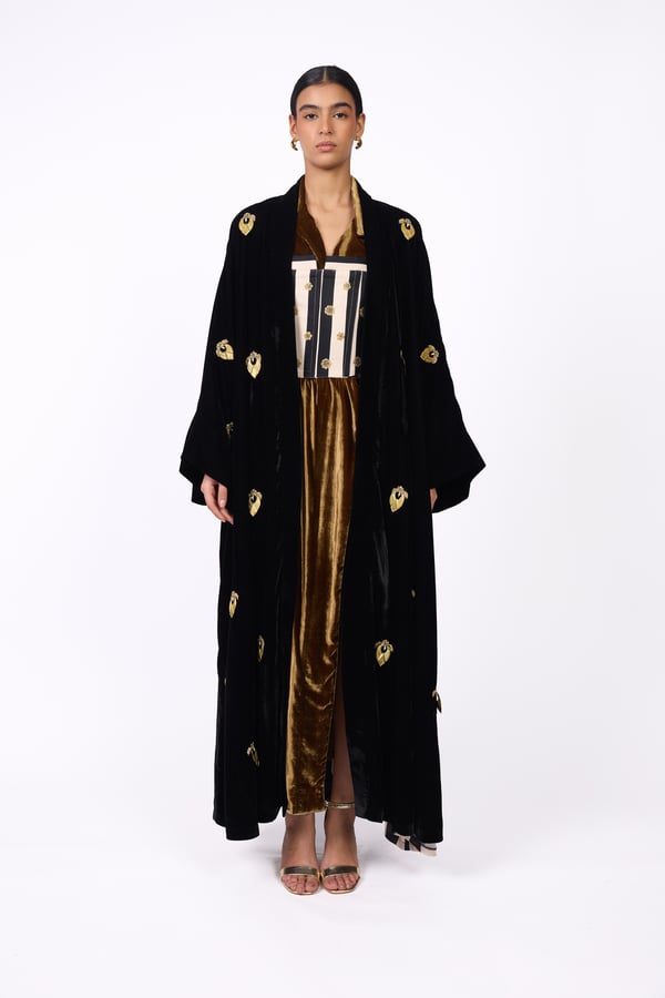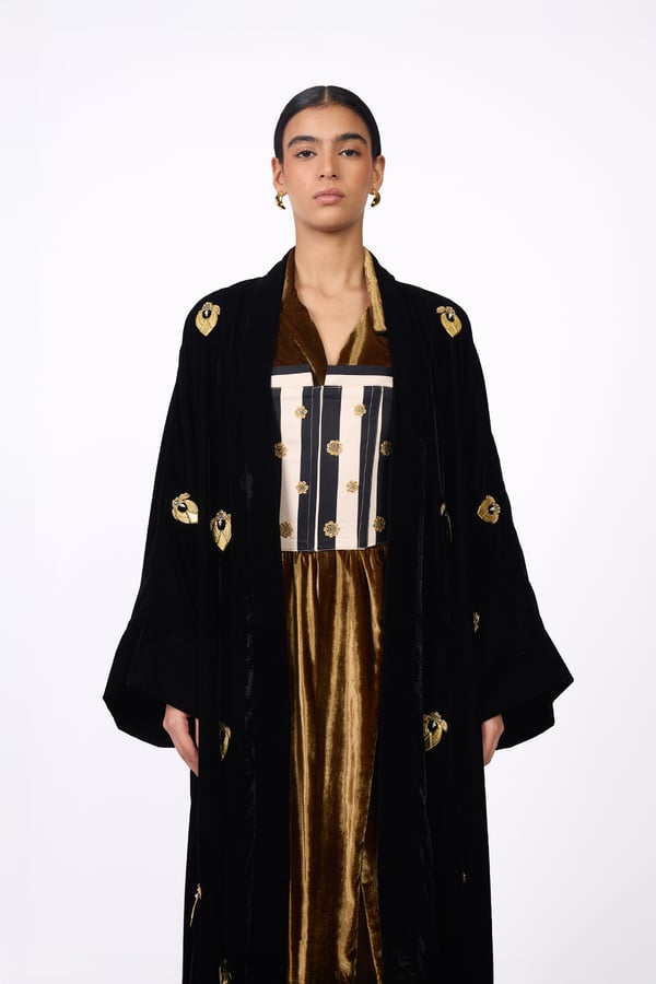 Elegant design with a heritage-inspired touch. It consists of three pieces: • A black bisht adorned with gold motifs, lined with silk fabric from the HZ brand. • A striped corset in black and white. • An inner piece made of silk velvet.