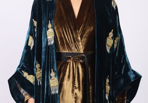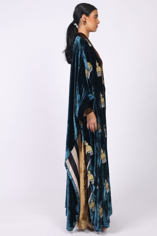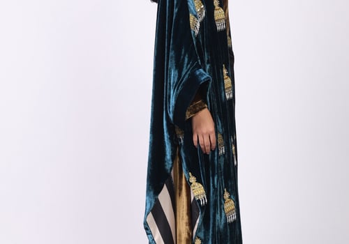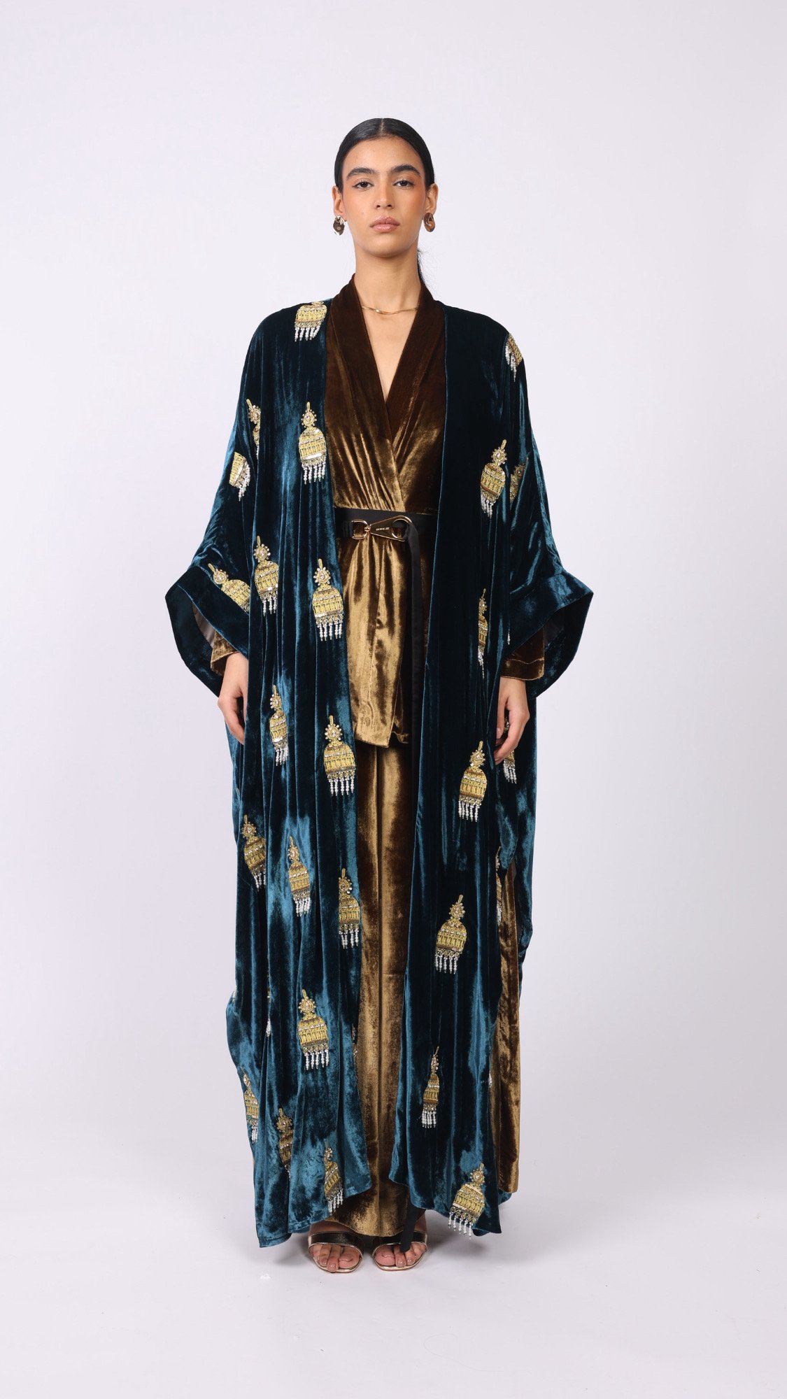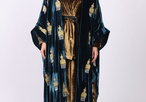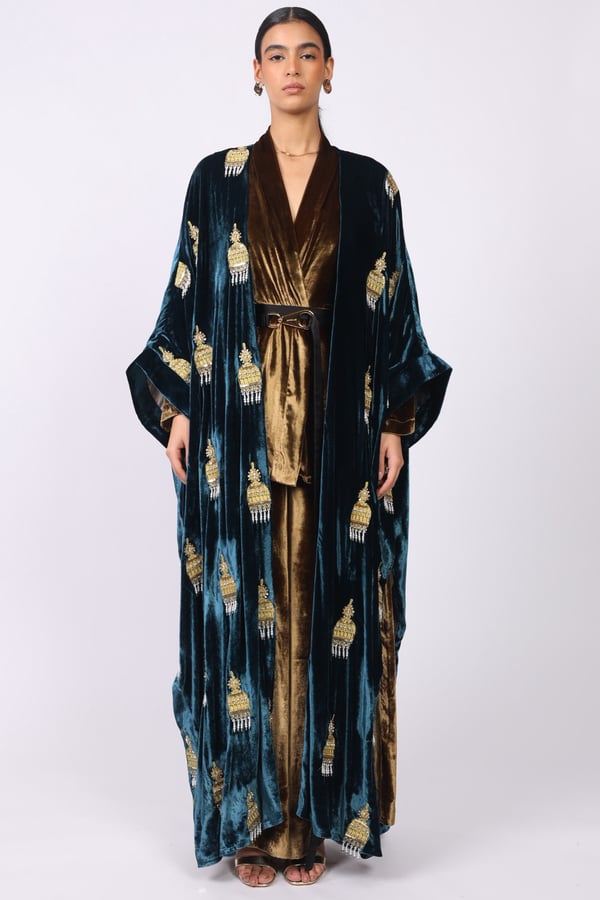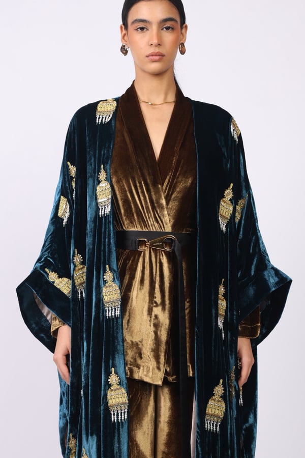 A luxurious design with a heritage-inspired touch. It consists of four pieces: • A blue silk-velvet bisht featuring distinctive embroidery, handcrafted detailing, and lined with silk fabric from the HZ brand. • Two silk-velvet pieces (a top and trousers). • A gold-based belt accented with a black strap.