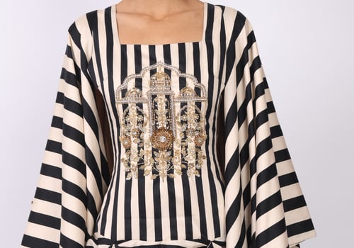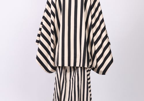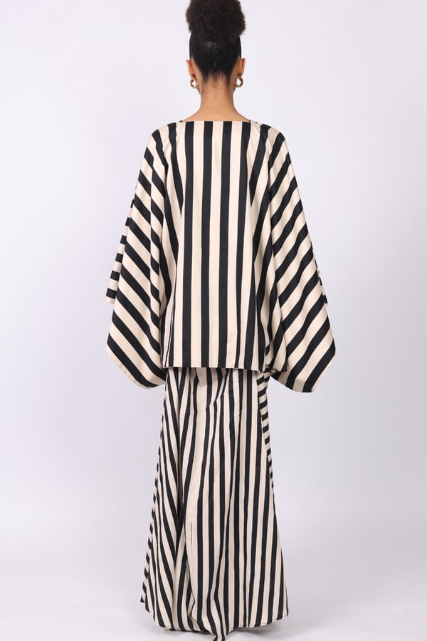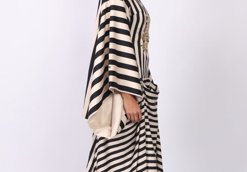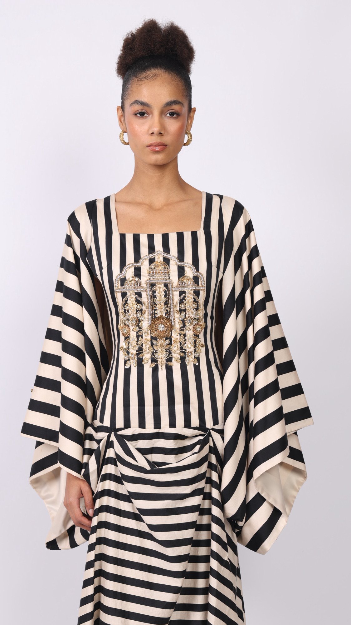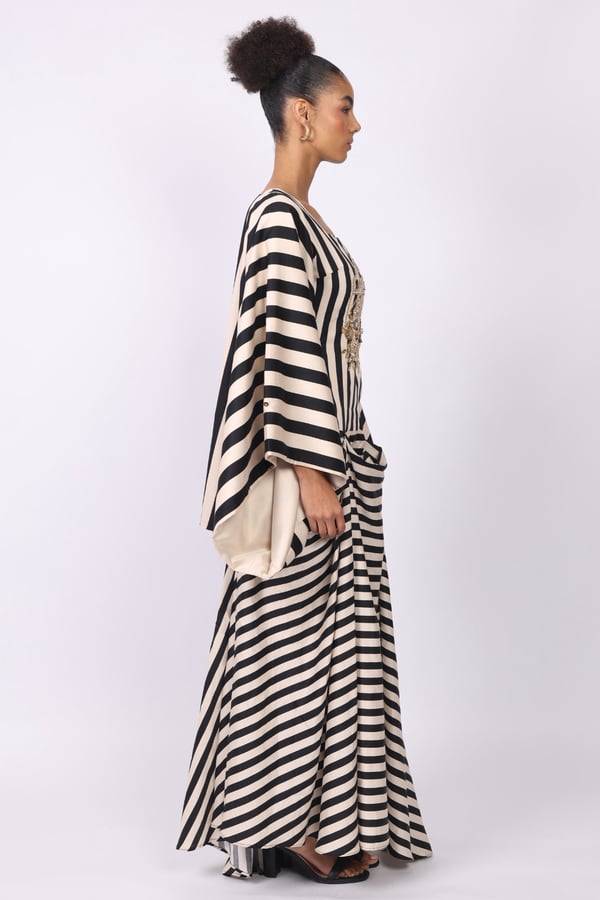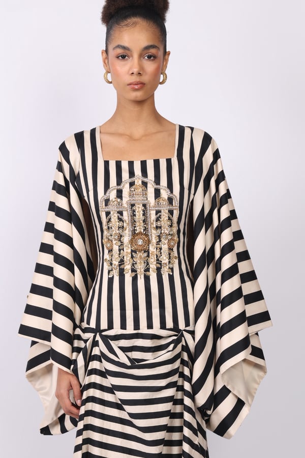 An elegant design that blends heritage with modernity. It consists of two pieces: • A sleeveless striped dress in black and ivory, adorned with a handcrafted gold embroidery. • A striped cape in black and ivory, lined with ivory fabric