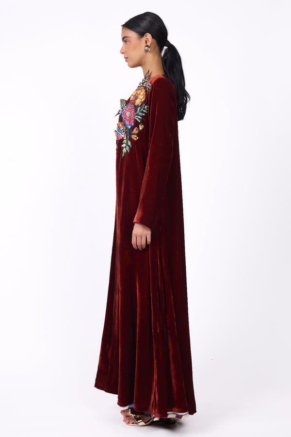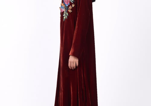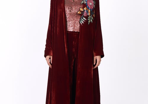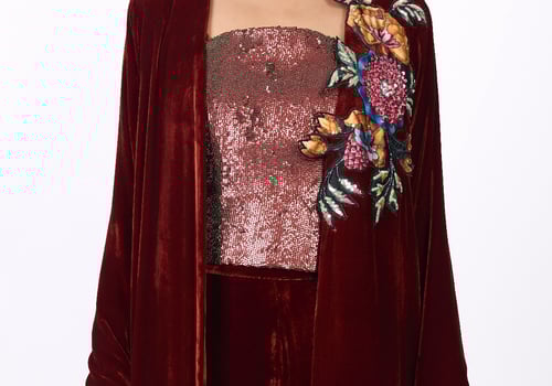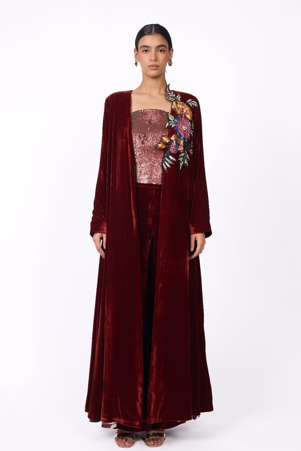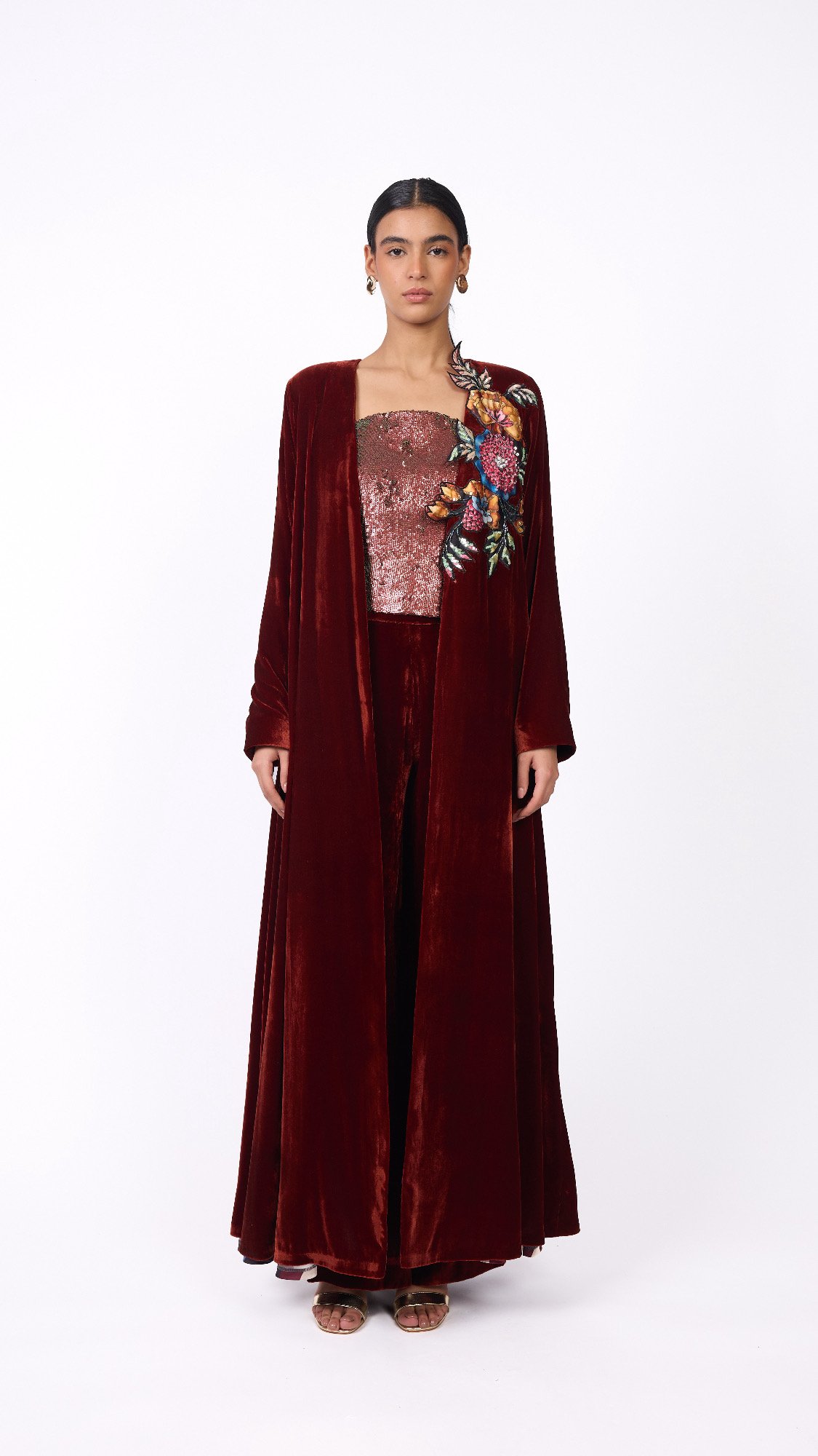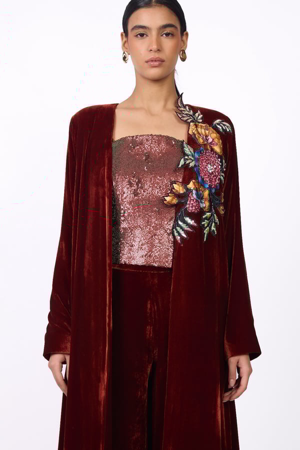 A luxurious and elegant design Consisting of three pieces: • A long cape made of silk velvet, lined with striped silk from the HZ brand, featuring floral embroidery on one side with hand-crafted detailing. • A sleeveless top adorned with shimmering sequins in matching color tones. • Wide-leg pants crafted from silk velvet.