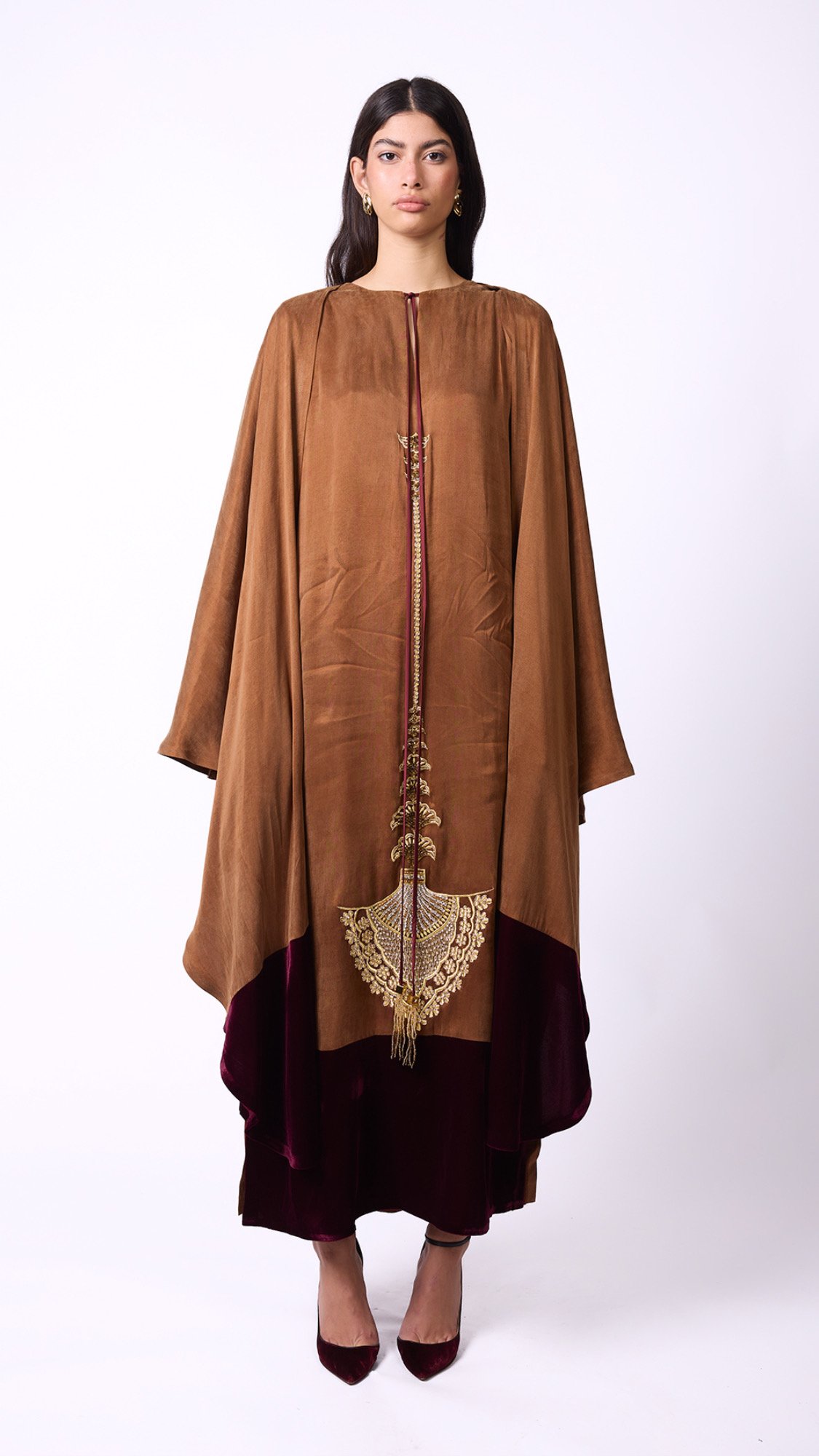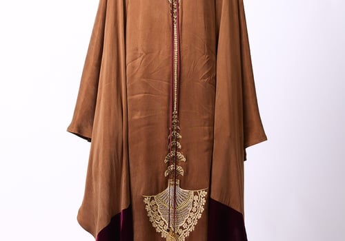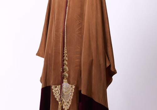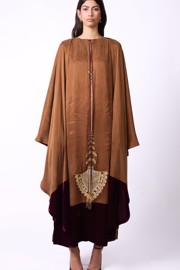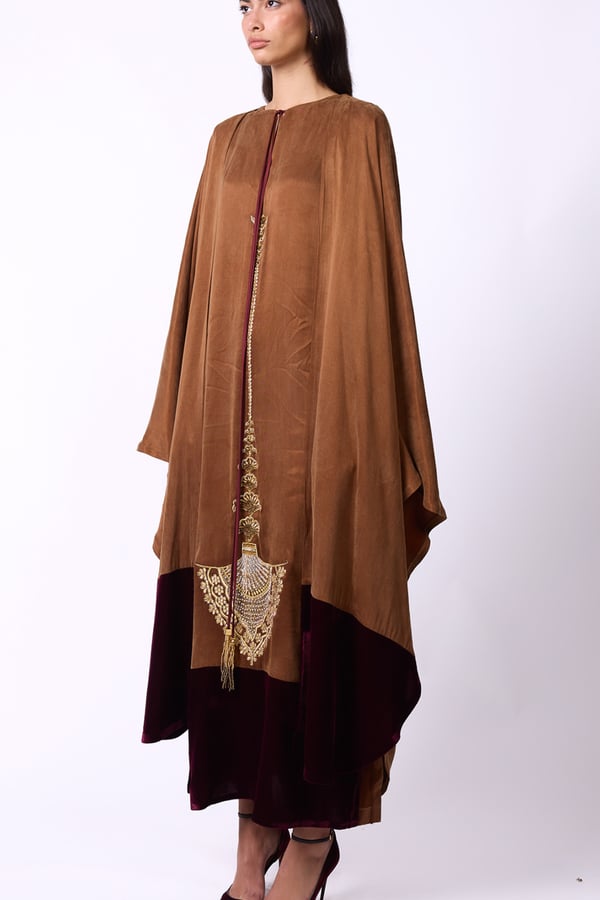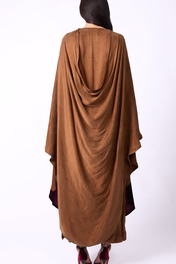 Elegant design with a heritage-inspired touch • A sleeveless brown washed-silk dress, adorned with gold embroidery and refined handcrafted detailing, featuring a fixed cape accented with a velvet touch.