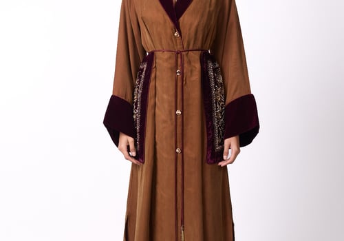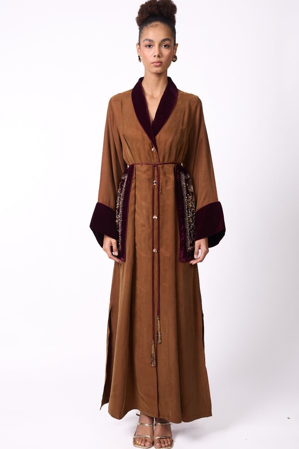 Luxurious design with a contemporary heritage touch • A brown washed-silk dress with a straight, flowing silhouette, featuring coordinated velvet trims and prominent gold handcrafted detailing on the sides that reflect fine craftsmanship. • The design is centered with a front button placket and a slim, tie-up belt in a rich burgundy tone.