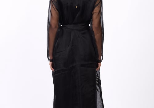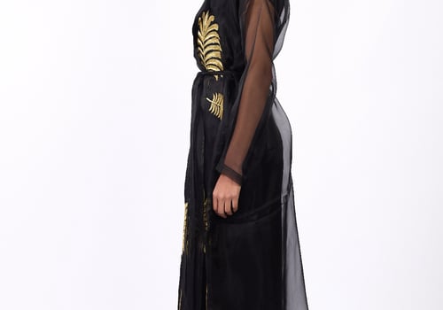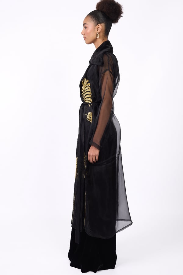Luxurious design with a heritage touch Consisting of three pieces: • A sheer black gazar trench coat, embellished with gold embroidery and finished with a waist-defining belt. • A black velvet top and trousers