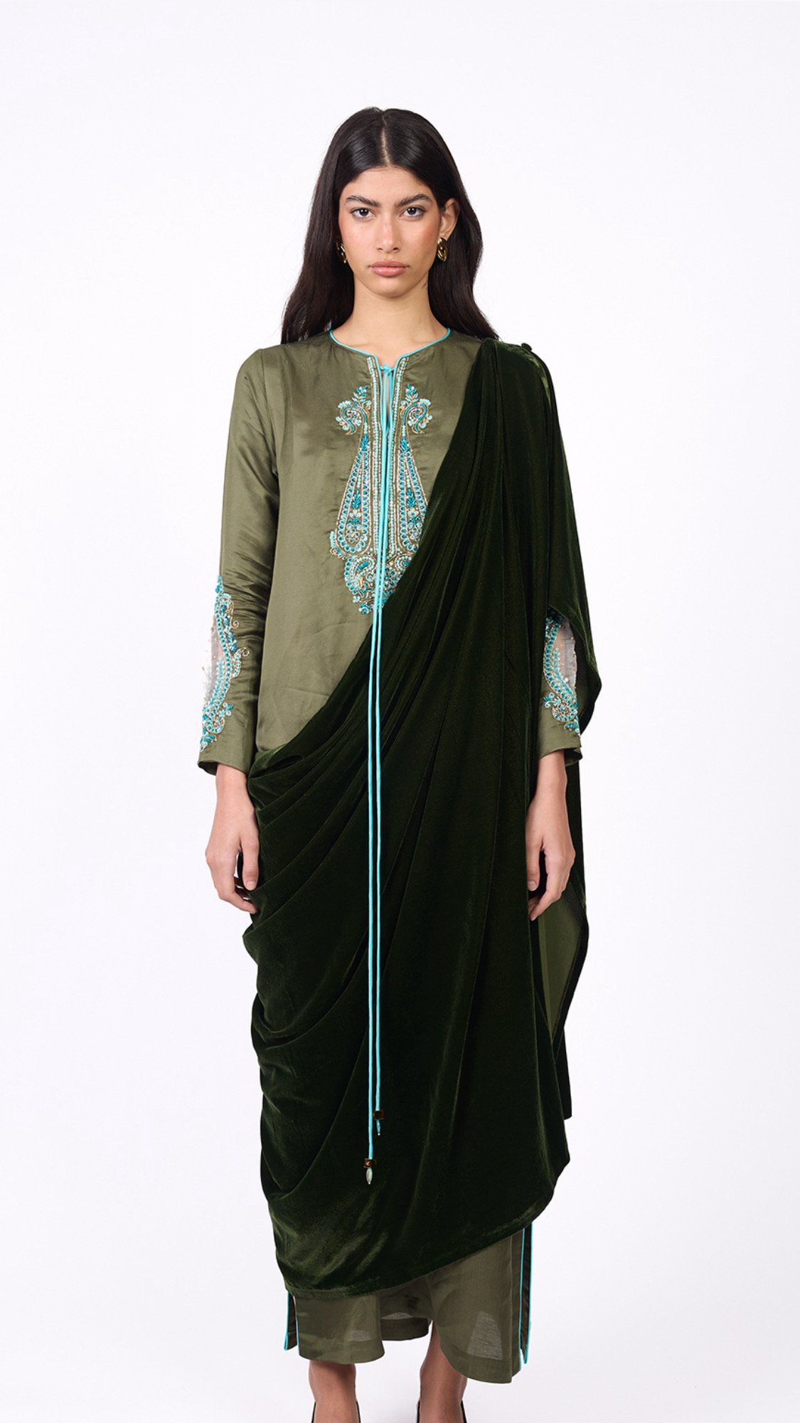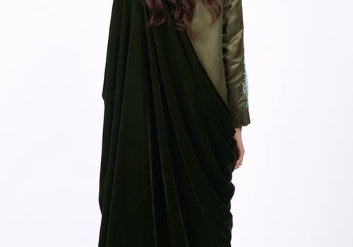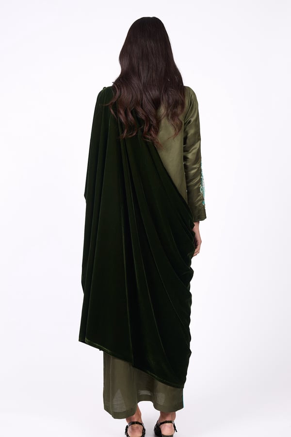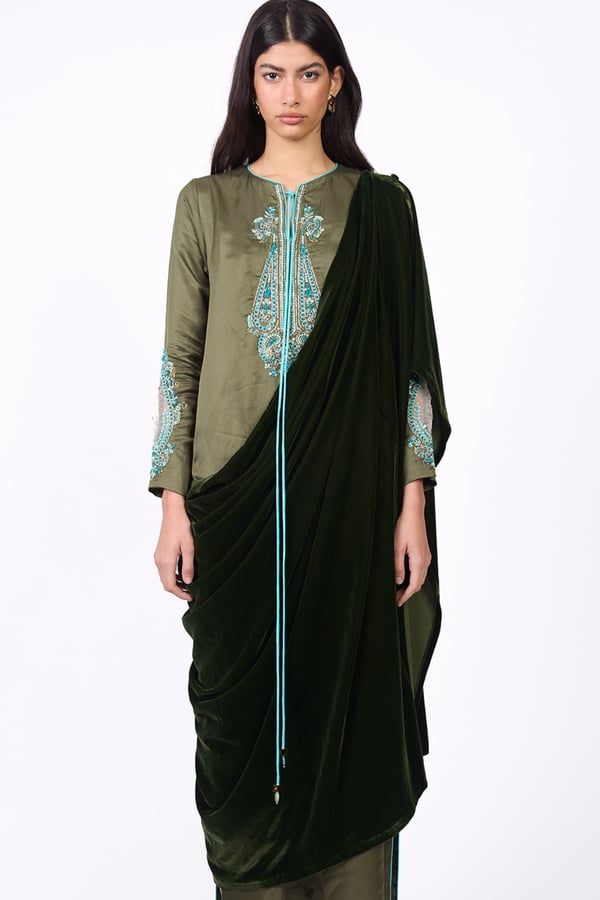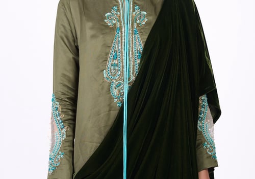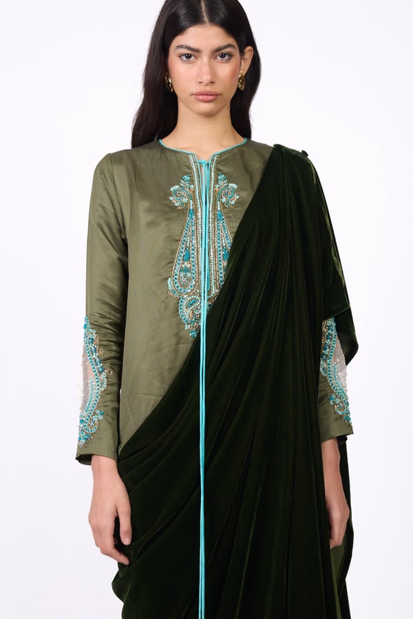 An elegant design with a modern heritage touch. Consists of two pieces: • An inner dress adorned with hand embroidery in gold and turquoise tones. • An outer piece crafted from olive-green velvet. Note: Please write the measurements in the notes section.