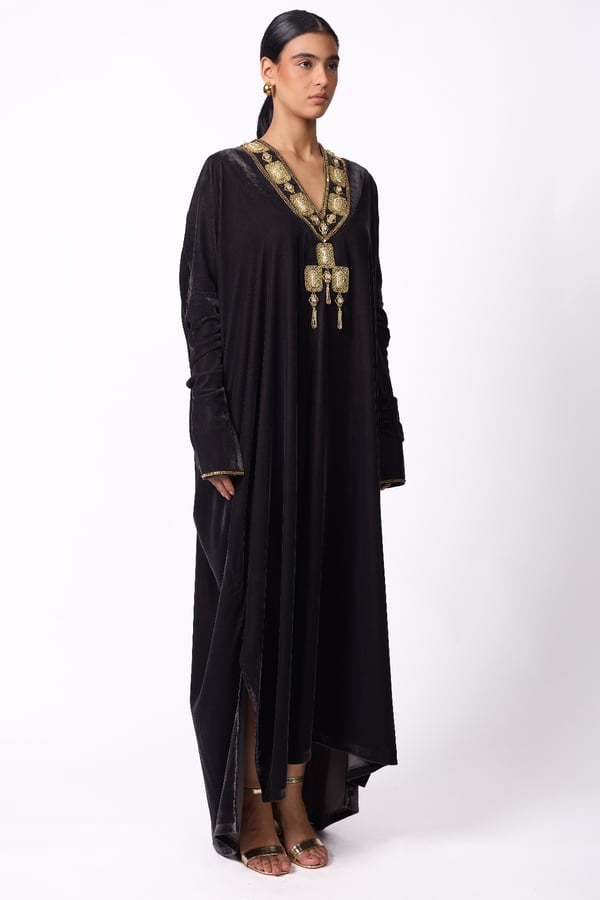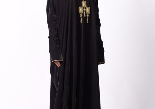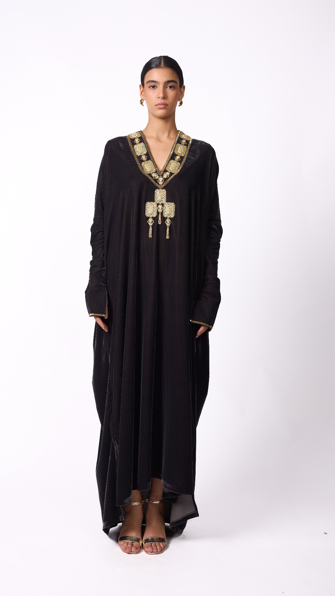 A grey velvet dress with a wide silhouette, adorned with distinctive and unique gold patterns.