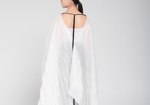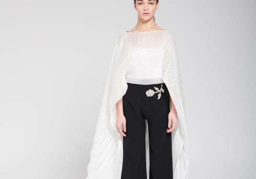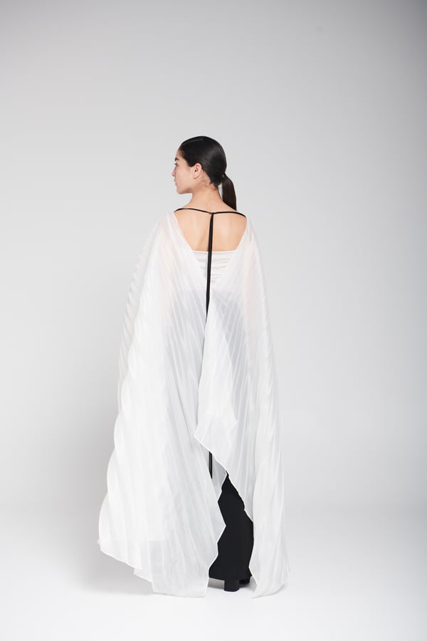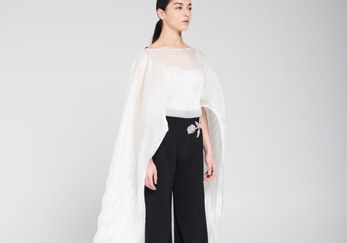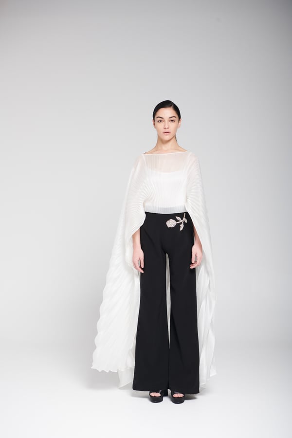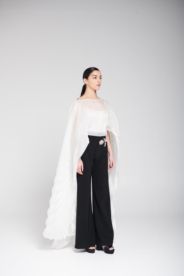 An elegant piece consisting of a gazar blouse designed in a cape style with pleated, flowing fabric that adds movement and sophistication to the look, paired with black wide-leg pants adorned with delicate hand embellishment for a refined and luxurious touch. • Delivery before Eid • Made-to-order items cannot be exchanged or returned • Ready pieces cannot be altered, and exchange or return is allowed within one day only.