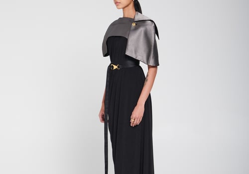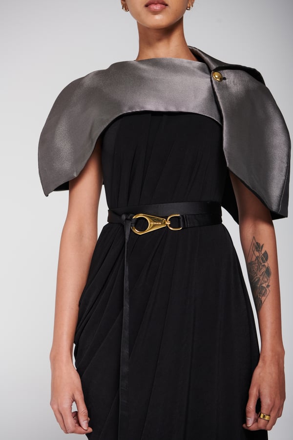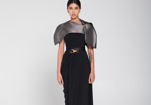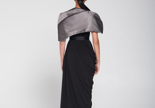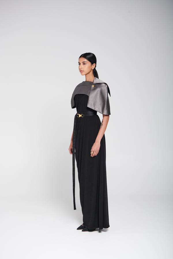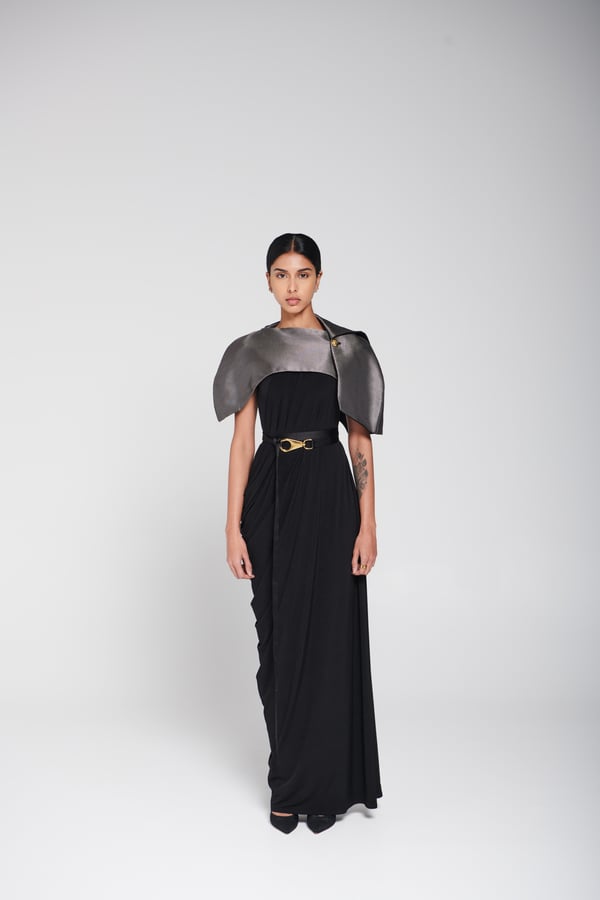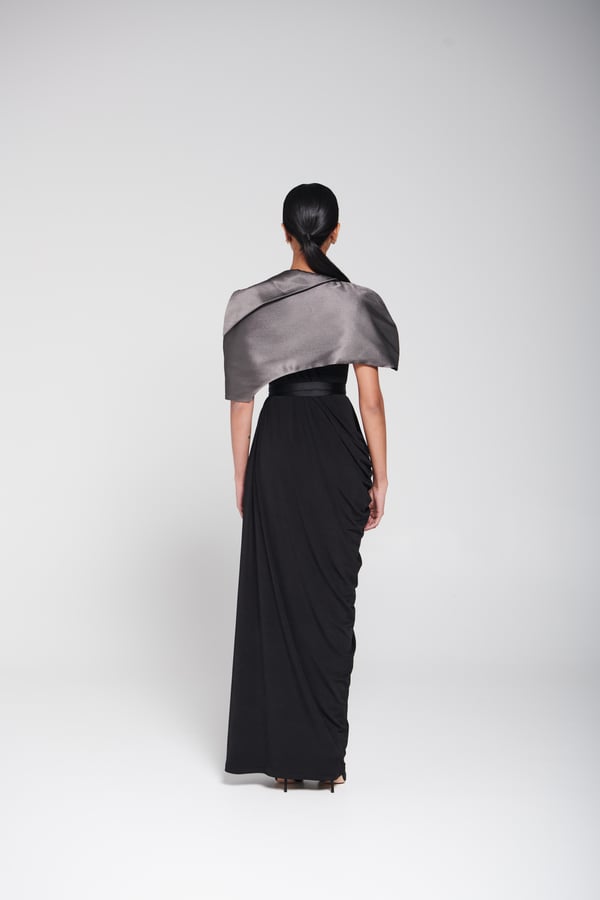 An elegant piece with a refined design, featuring a black dress made of stretch fabric with a flowing silhouette and soft draped details that enhance the figure, complemented by a luxurious cape top that adds a modern and sophisticated touch to the look. • Delivery before Eid • Made-to-order items cannot be exchanged or returned • Ready pieces cannot be altered, and exchange or return is allowed within one day only.