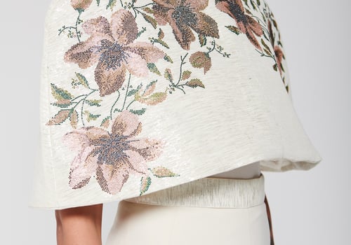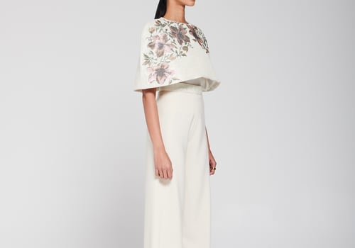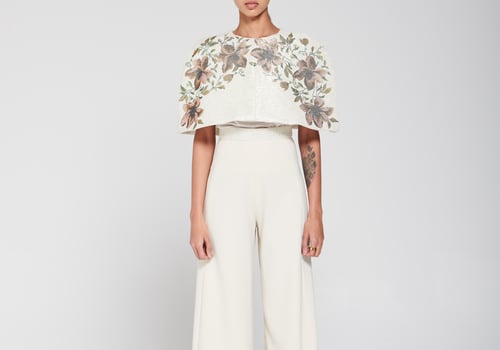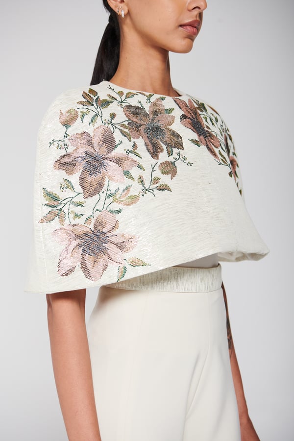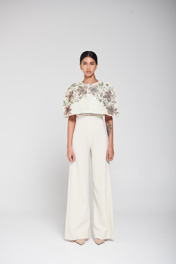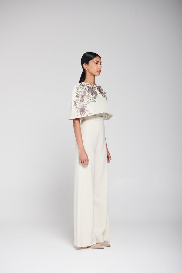 An elegant set featuring a short cape made of luxurious fabric adorned with delicate floral embroidery that adds a refined feminine touch, paired with wide-leg pants with a flowing silhouette for a modern and sophisticated look. • Delivery before Eid • Made-to-order items cannot be exchanged or returned • Ready pieces cannot be altered, and exchange or return is allowed within one day only