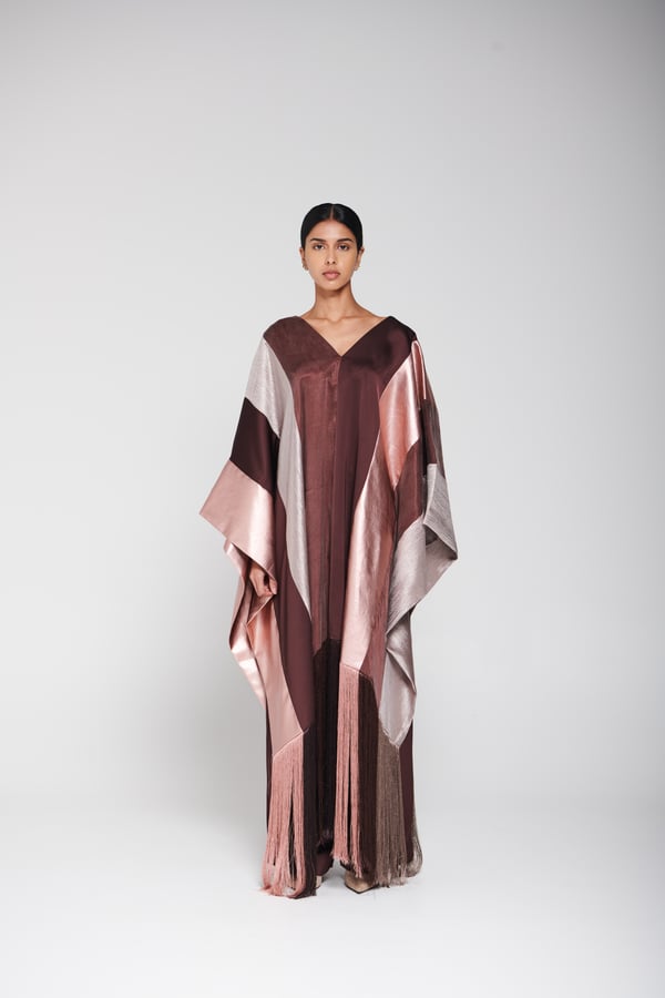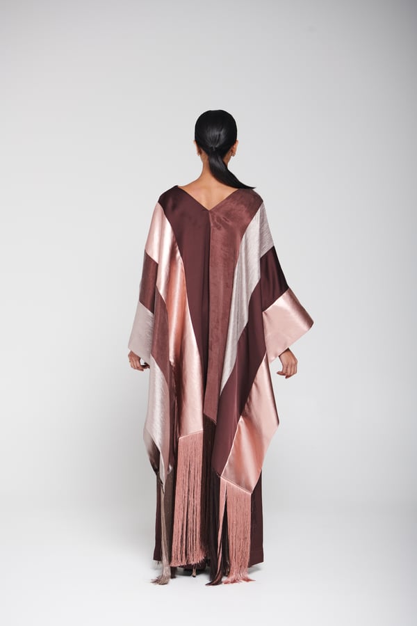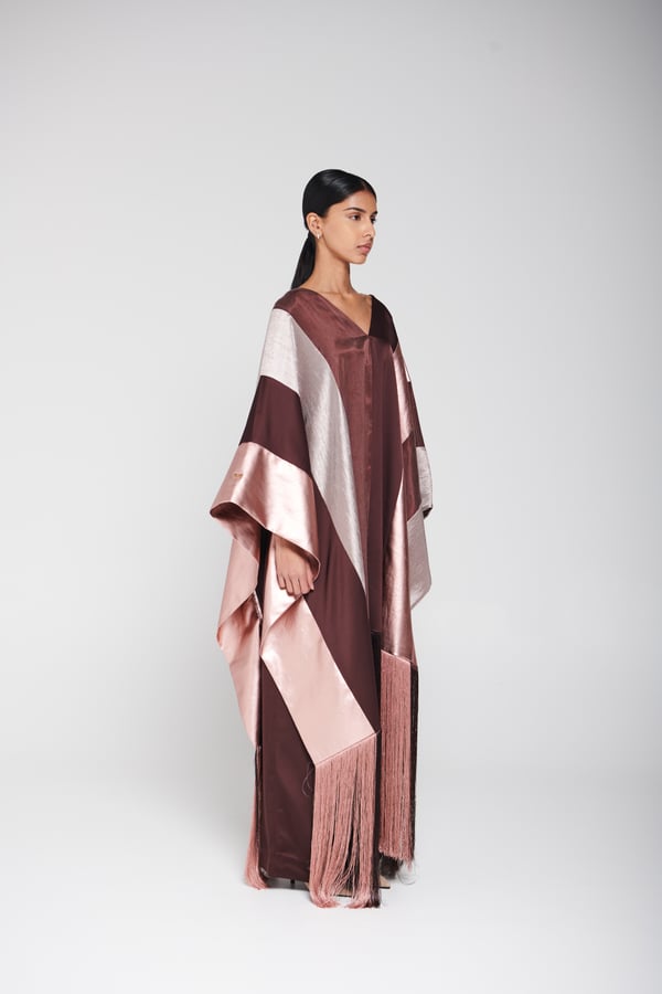 An elegant set featuring a long cape made of luxurious fabric with distinctive color gradients, flowing details, and soft fringes that add movement to the look. It comes with simple-cut pants to create a complete modern and sophisticated outfit. • Delivery before Eid • Made-to-order items cannot be exchanged or returned • Ready pieces cannot be altered, and exchange or return is allowed within one day only