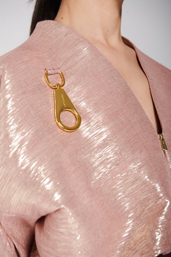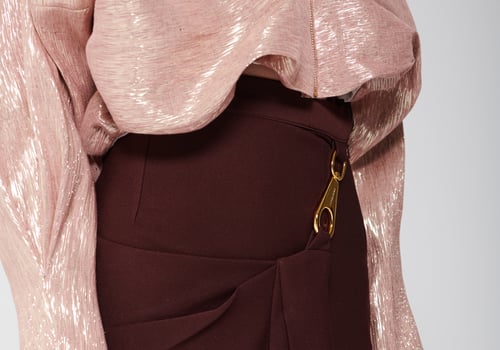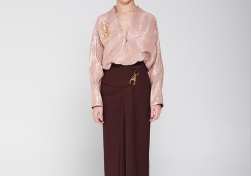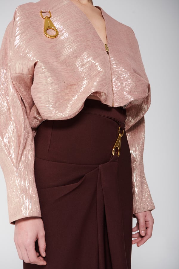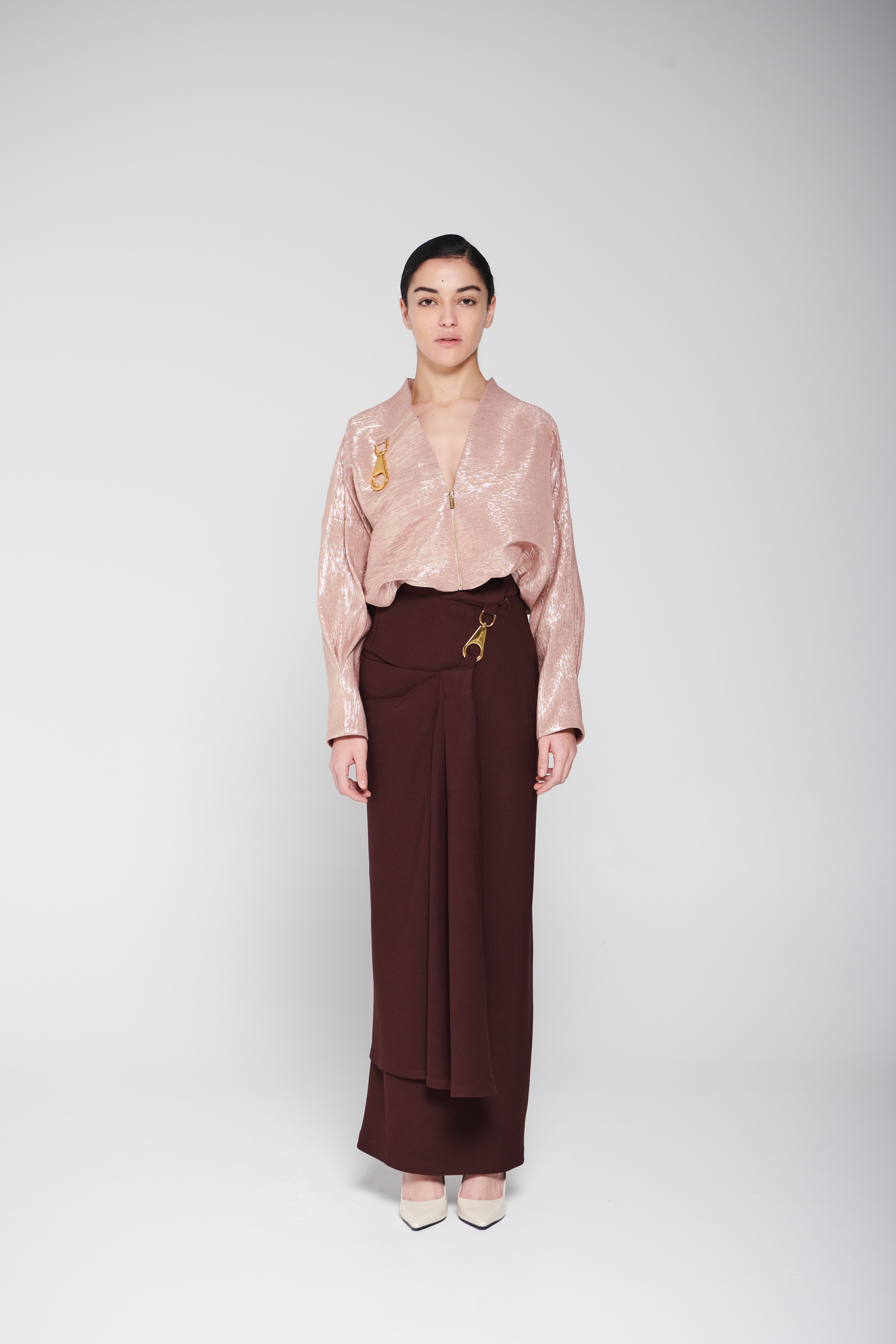 An elegant set featuring a shimmering blouse with a modern design, front zipper, and distinctive metallic details, paired with a long skirt with soft draped detailing that adds a refined and flowing touch to the look. • Delivery before Eid • Made-to-order items cannot be exchanged or returned • Ready pieces cannot be altered, and exchange or return is allowed within one day only