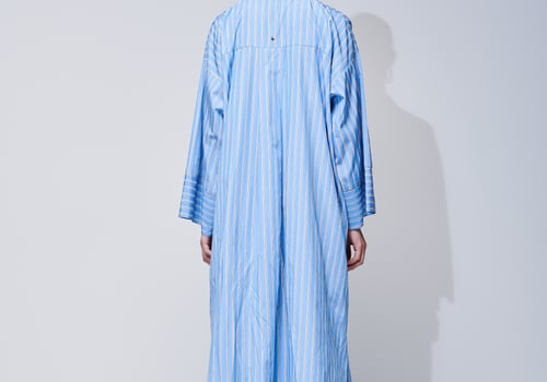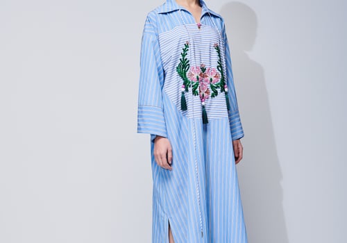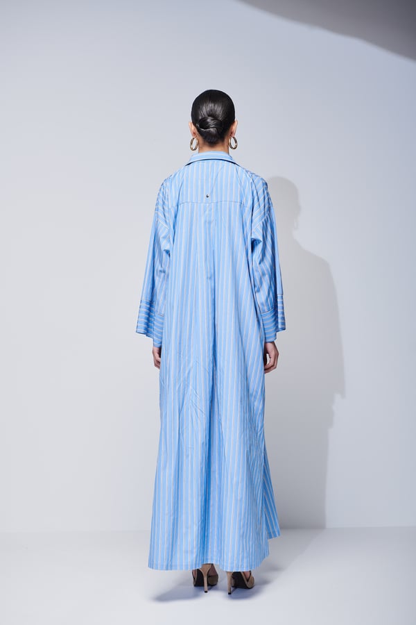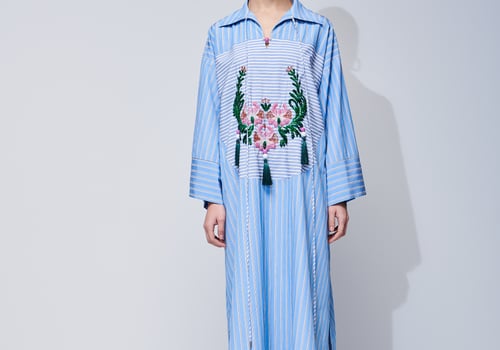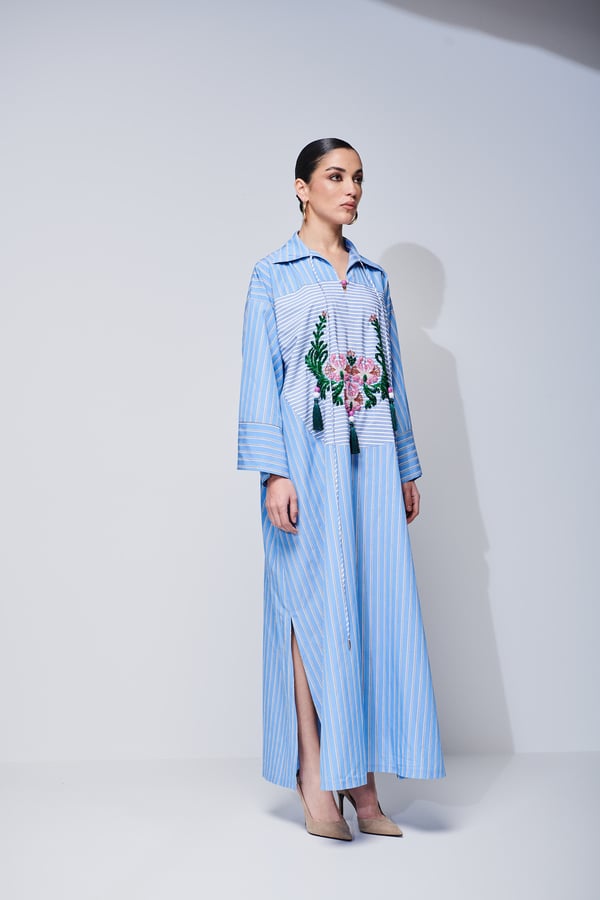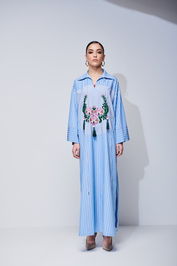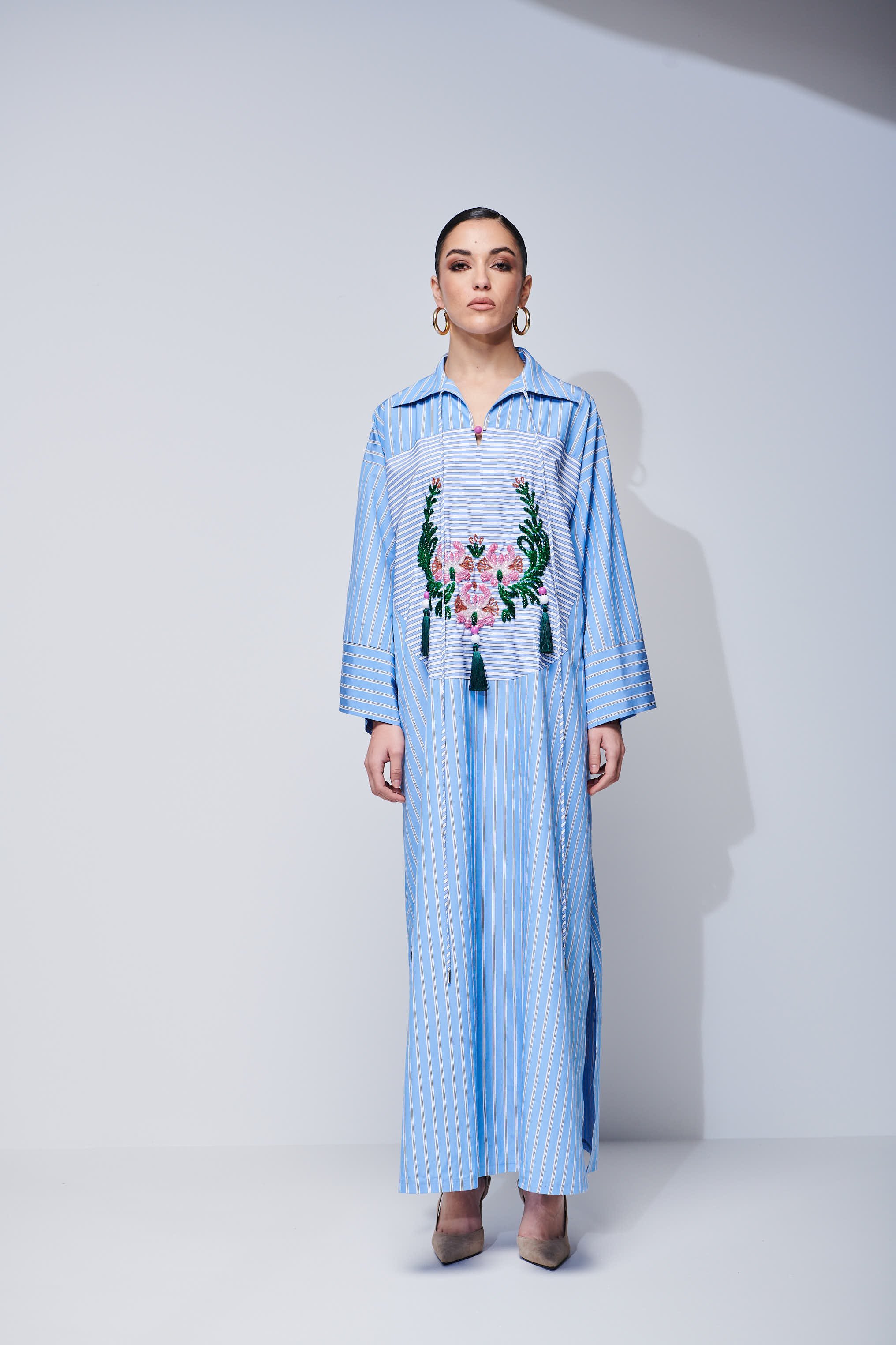 An elegant piece made from blue striped fabric with a comfortable loose silhouette and wide sleeves, adorned with distinctive hand embellishment and soft tassels on the chest that add a feminine and modern touch to the look. • Delivery before Eid • Made-to-order items cannot be exchanged or returned • Ready pieces cannot be altered, and exchange or return is allowed within one day only