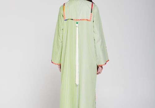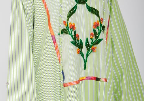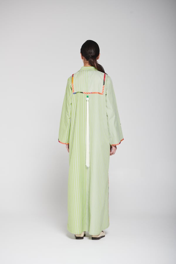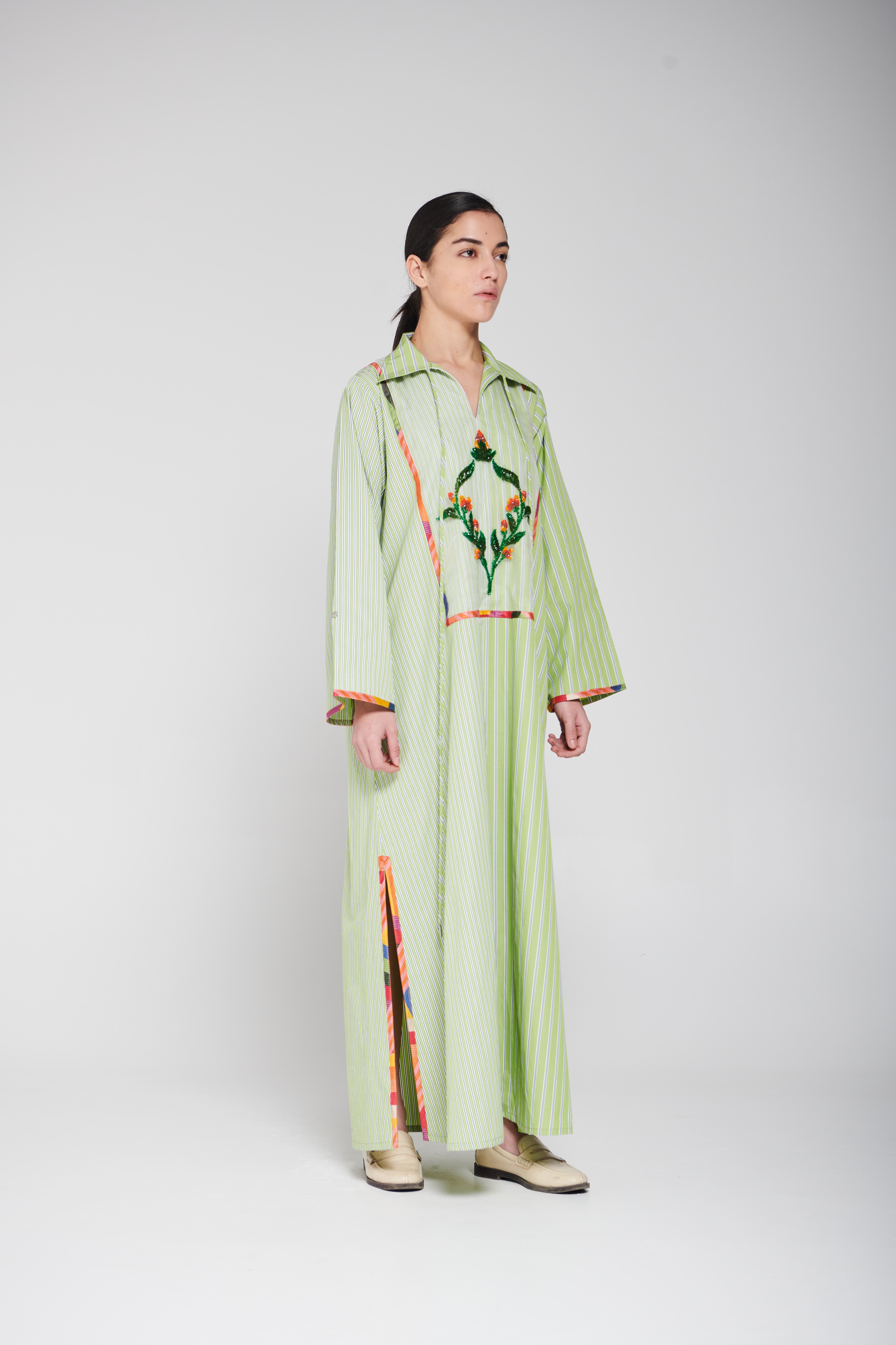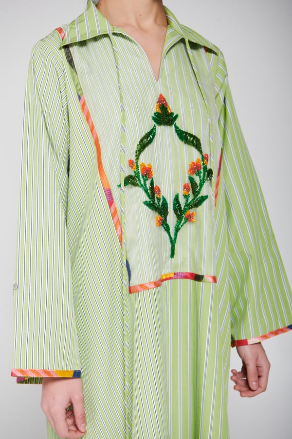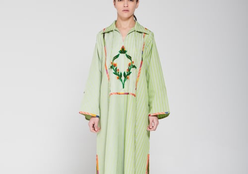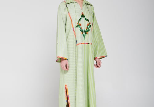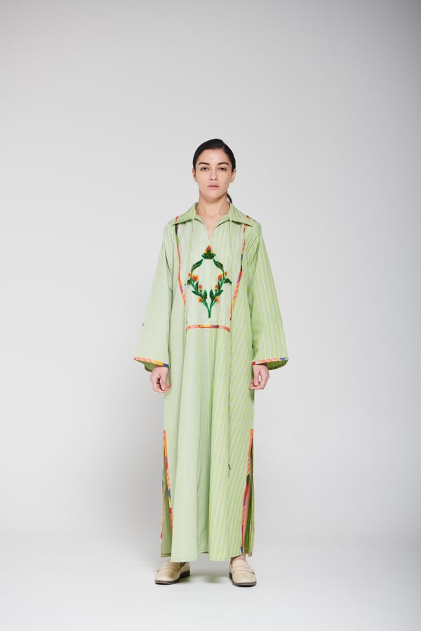 An elegant piece made of striped fabric in a calm green color, designed with a long flowing cut, wide sleeves, and a classic collar. It features distinctive hand embroidery at the center with colorful details that add an artistic and refined touch, giving the look a modern and elegant feel Delivery before Eid • Made-to-order items cannot be exchanged or returned • Ready pieces cannot be altered, and exchange or return is allowed within one day only